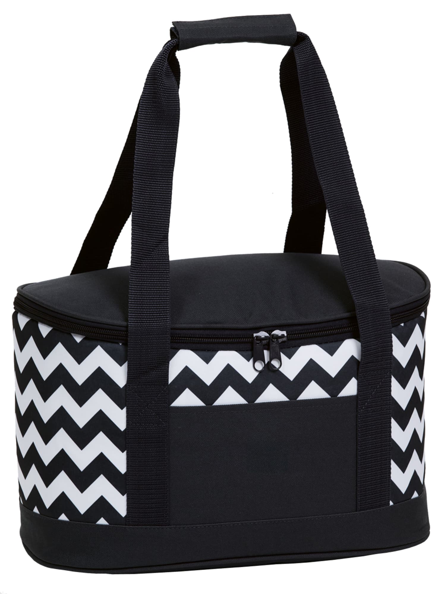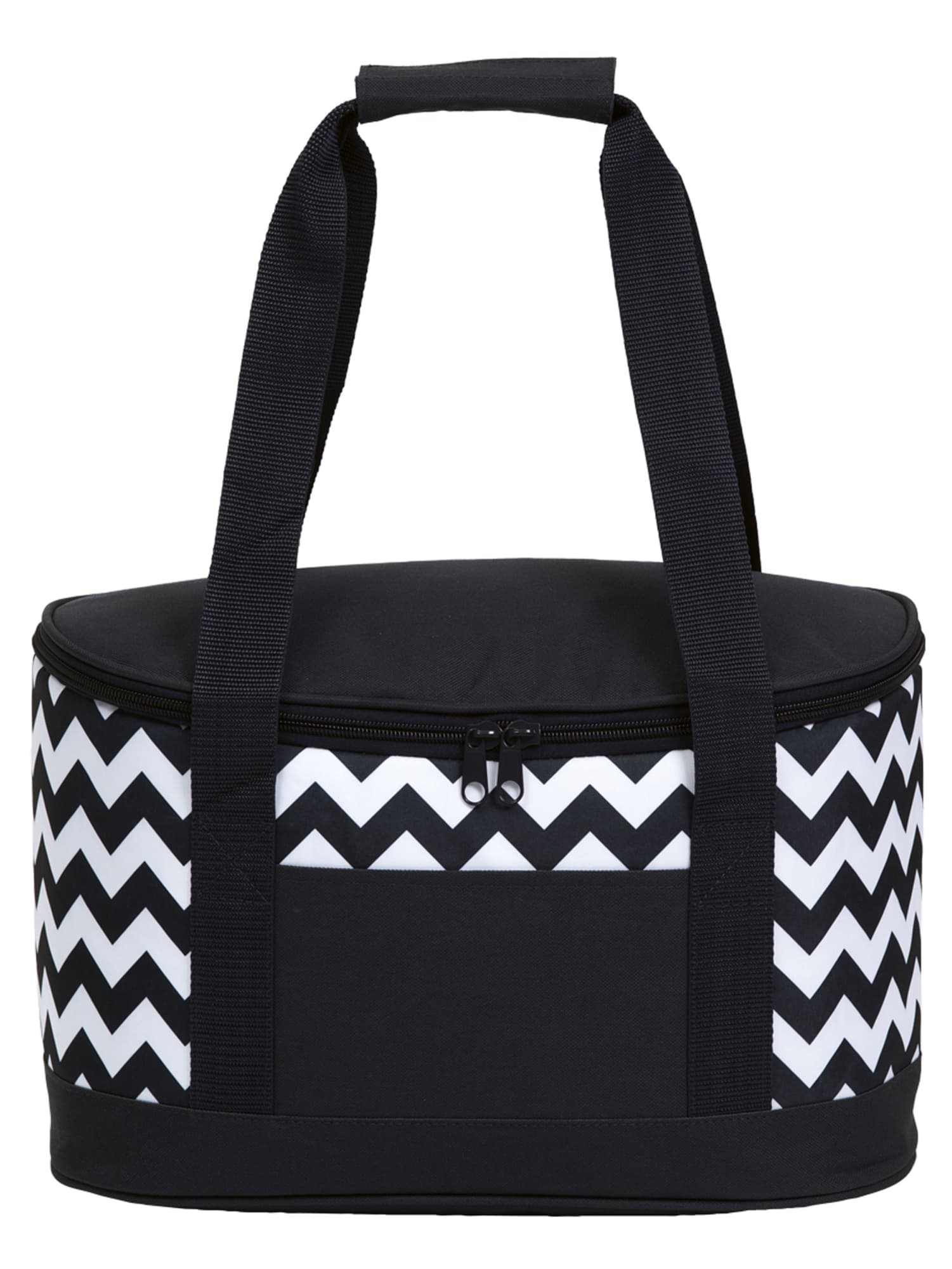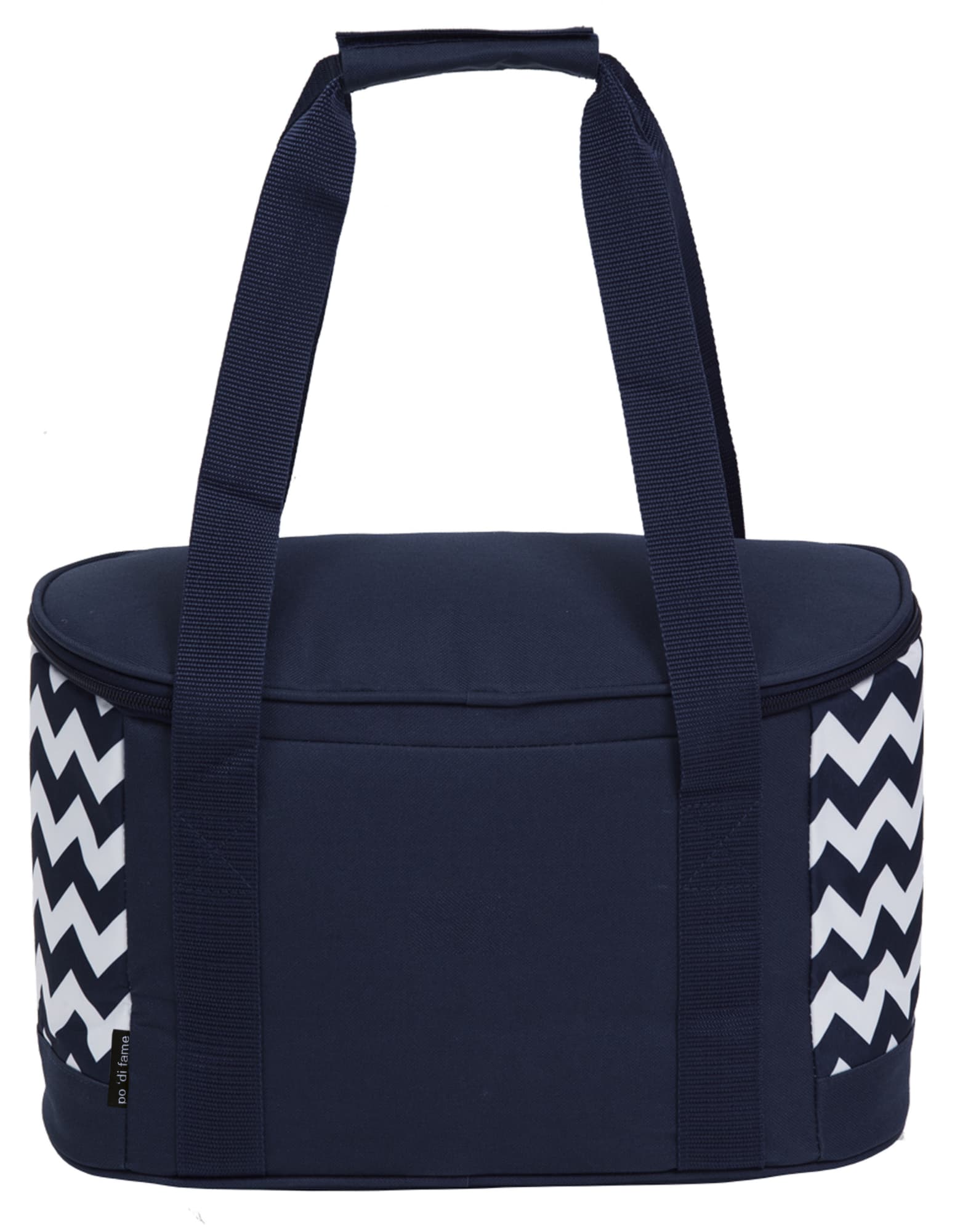 Chevron Printed 600D & 300D polyester|Heat sealed leak-proof PEVA lining|D shaped zippered opening to main insulated cooler compartment|Webbing carry handles with Velcro wrap closure|Front accessory slip pocket|po ‘di fame pip|Capacity: 19 Litres