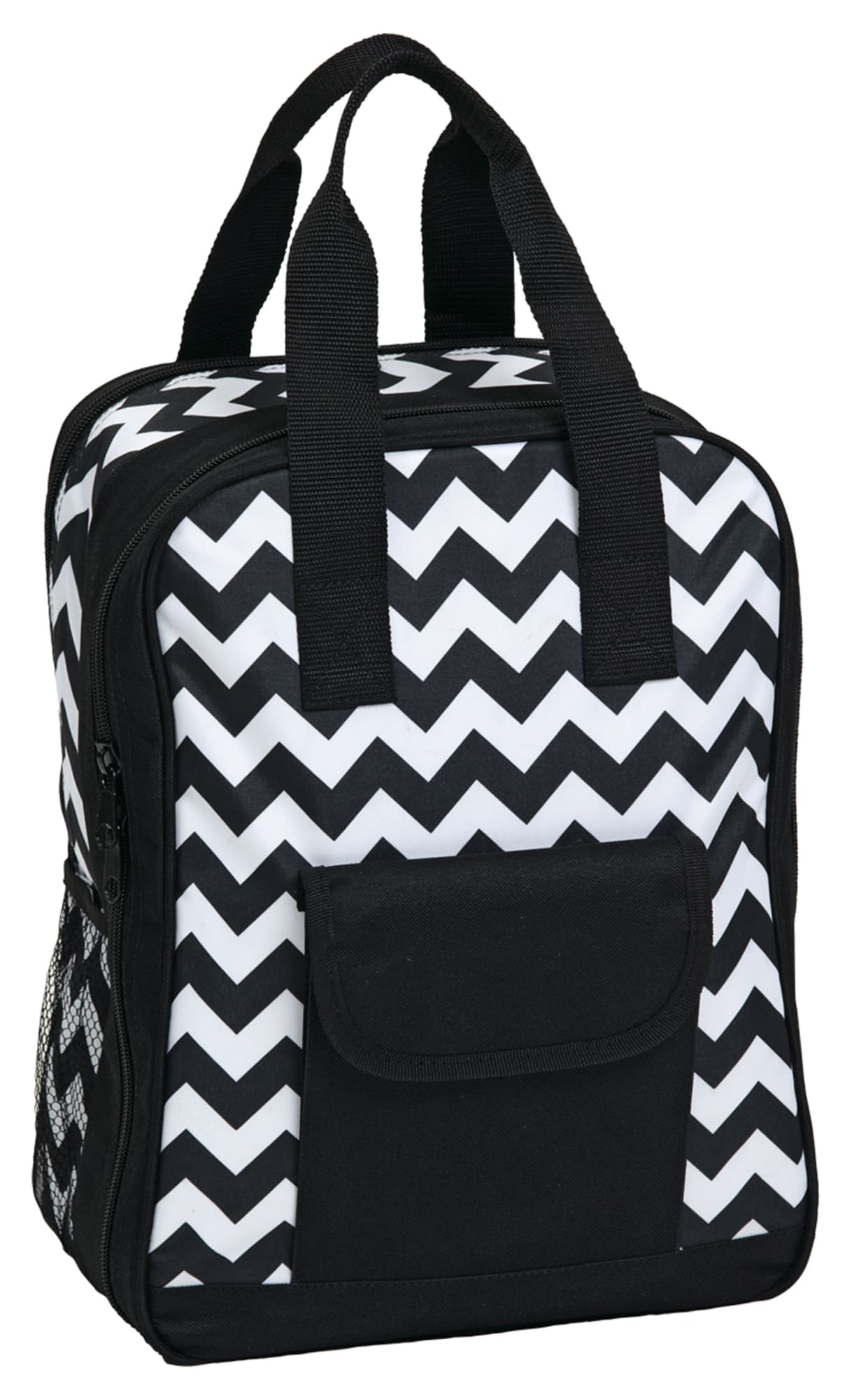 Chevron printed 600D & 300D polyester|4 person picnic set|Large insulated cooler compartment with PEVA lining|Picnic Set includes 4 x knives, 4 x forks, 4 x spoons, 4 x 9″ plates, 4 x plastic wine glasses, 4 x cotton napkins, 2-pcs salt & pepper shakers, 1 x bottle opener, 1 x cutting board, 1 x cheese knife|Front accessory pocket with Velcro closure|Dual mesh side accessory pockets|Webbing carry handles