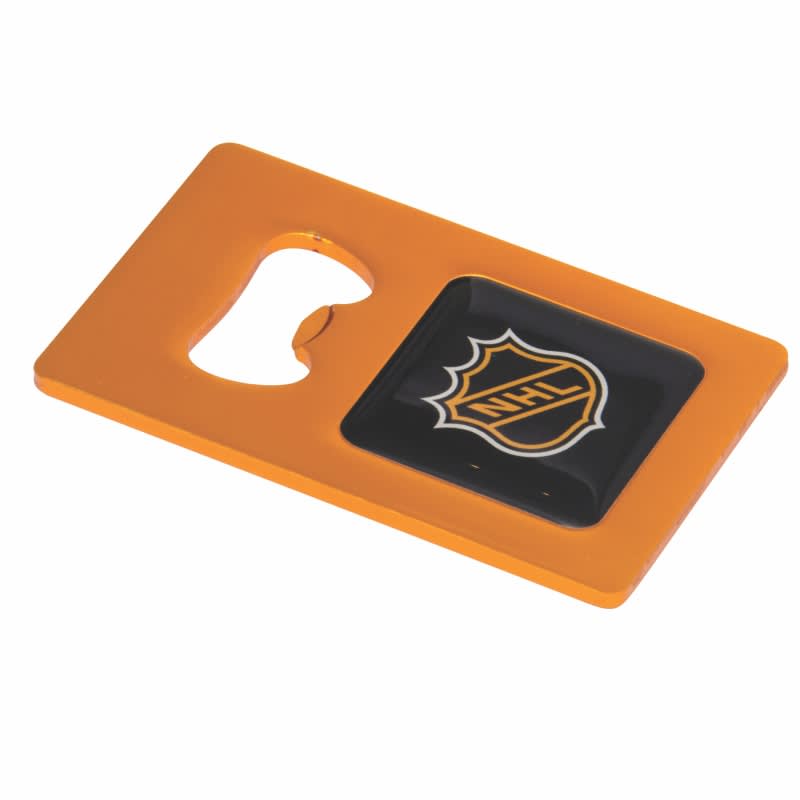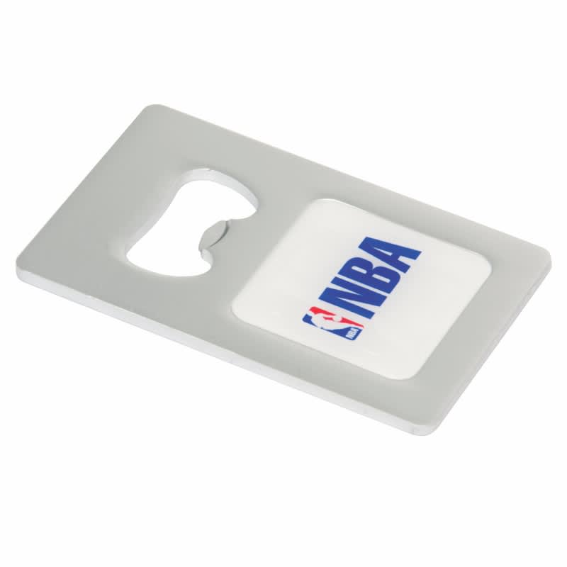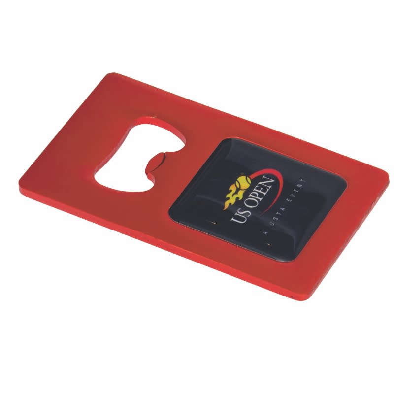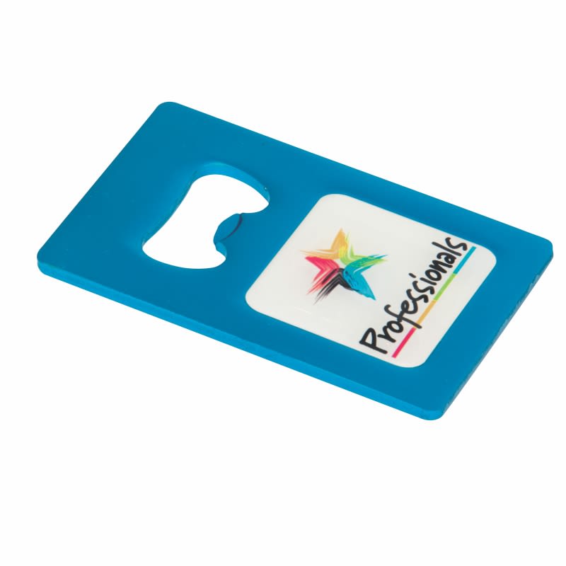 This convenient bottle opener is made from light-weight aluminium and slips easily into your wallet or pocket. Your logo is printed in full colour under a protective dome. Available in 10 colours. (Due to the production process, fine moulding lines may be visible – this will not affect the performance of the product).