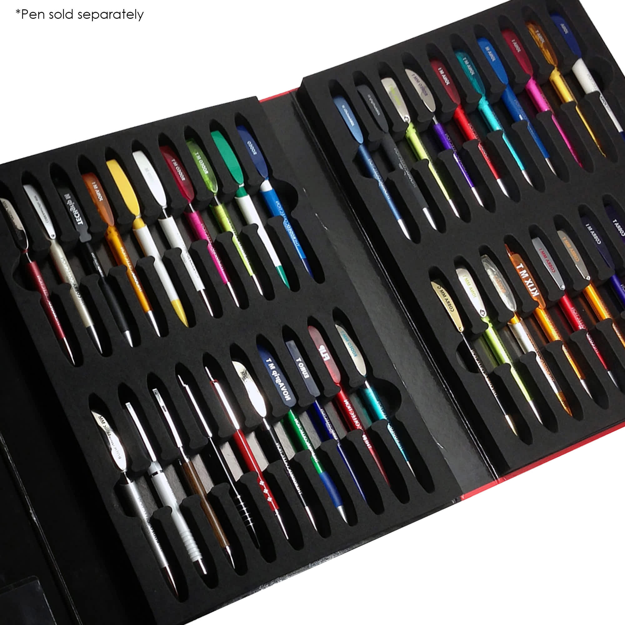 Cardboard paper sample pen folder. Flip open lid has a business card pouch inside and magnetic closure. Die-cut foams hold 40 pens in total (pens not included) it fits most of pen styles. A handy sales tool for sales people and a great pen presenter in your showroom.