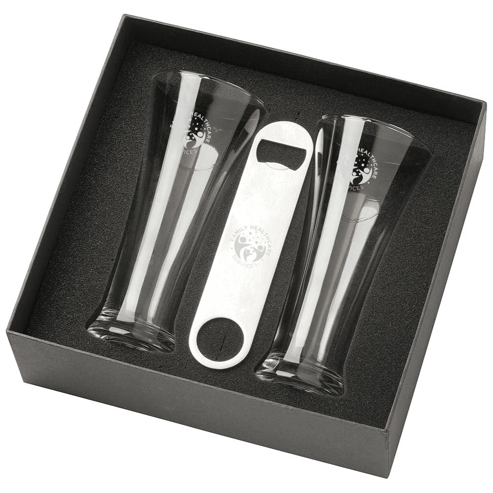 Two piece Pilsner glass set with opener. Supplied in a classy two part black gift box with foam insert. 350ml capacity.