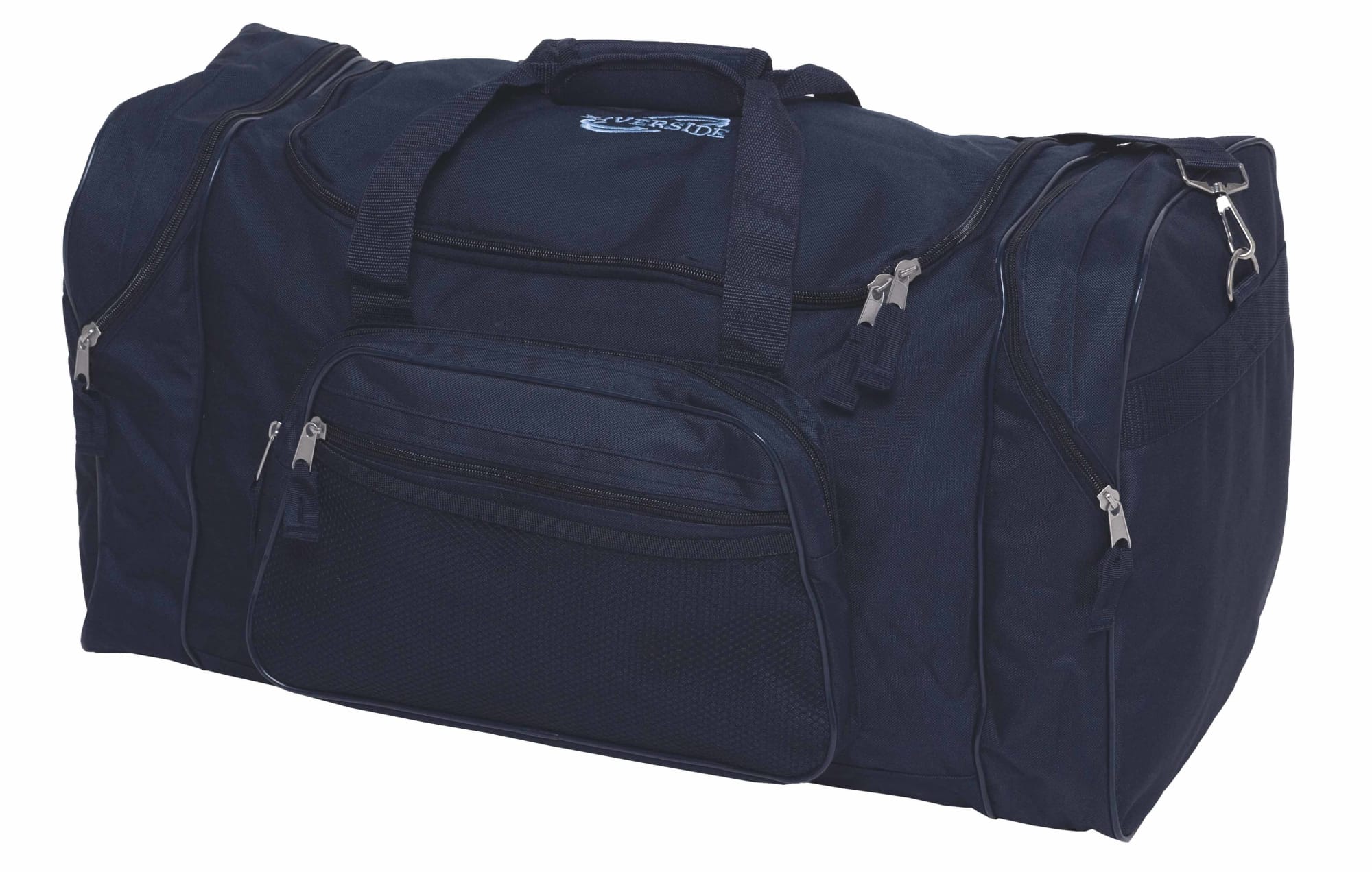600D polyester with latex rubber backing|Huge main compartment with U-shaped zippered opening|Shaped front pocket with mesh trim|Curved zipper on end pockets|Detachable/adjustable padded shoulder strap|Velcro wrap carry handle for comfortable grip|Heavy duty zippers and accessories|Capacity: 71 Litres