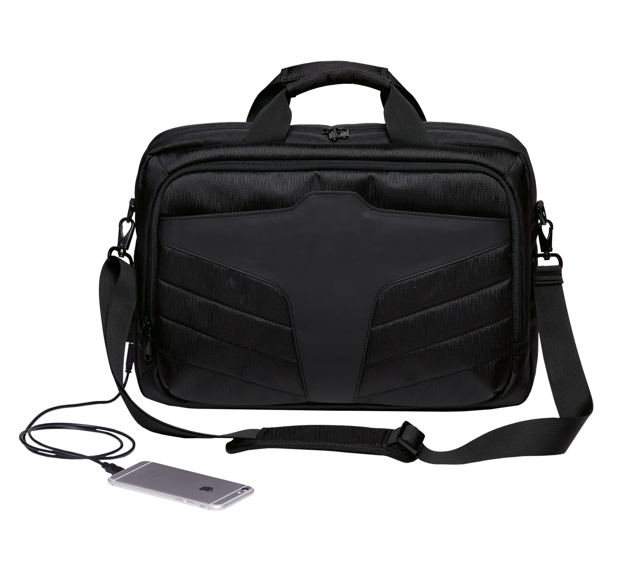 Jacquard polyester and water resistant 900D coated polyester|External USB charger port with integrated internal cable to charge your device|Three main zippered fully cell foam padded universal storage compartments including dual 15.6” laptop and 10.1” tablet compartments|Multiple organiser pockets|Padded grab handles|Detachable/adjustable padded shoulder strap with metal buckles and accessories|Back webbing panel can slip over wheeled bag handle|Capacity: 14 Litres