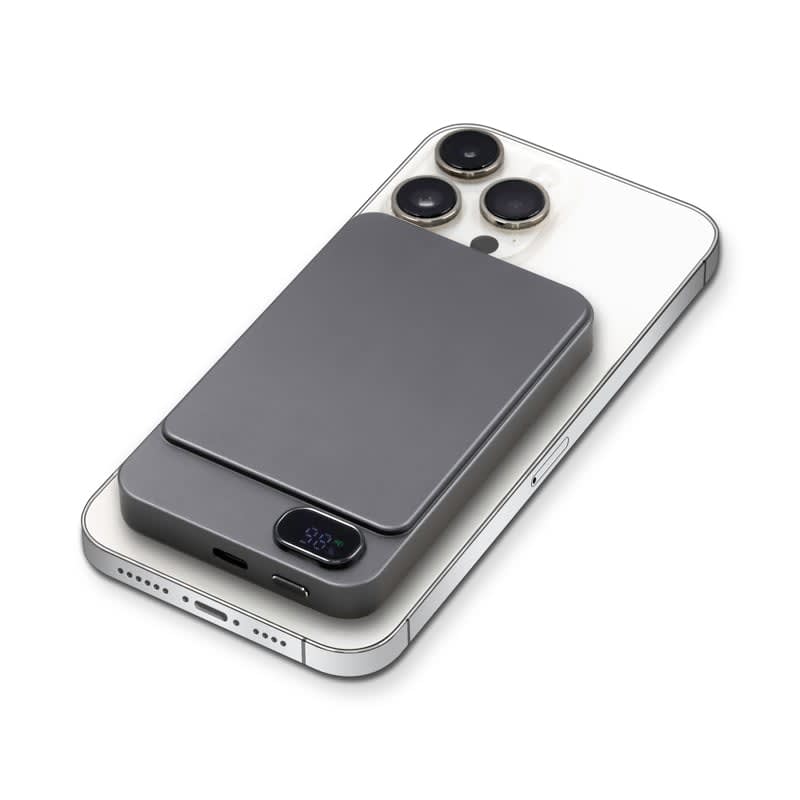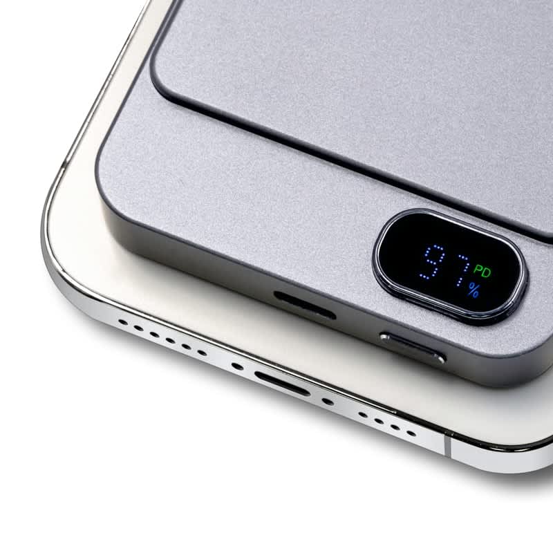 The Powerwave 5000 is a slim, lightweight, portable charger with a sleek aluminium unibody. Its 5,000 mAh capacity supports 15W fast wireless charging (Magsafe, Qi1, and Qi2) and comes with a 20W (PD 3.0) USB-C port for charging devices requiring a wired connection. The clear LCD shows the battery level and charging status, while built-in smart chip technology protects devices from overcurrent, overcharging, overheating, and short-circuiting. It includes a Type-C charger cable, a user manual, and a magnetic ring that can be stuck to the rear of non-magnetic charging smartphones. Material: Recycled Aluminium.