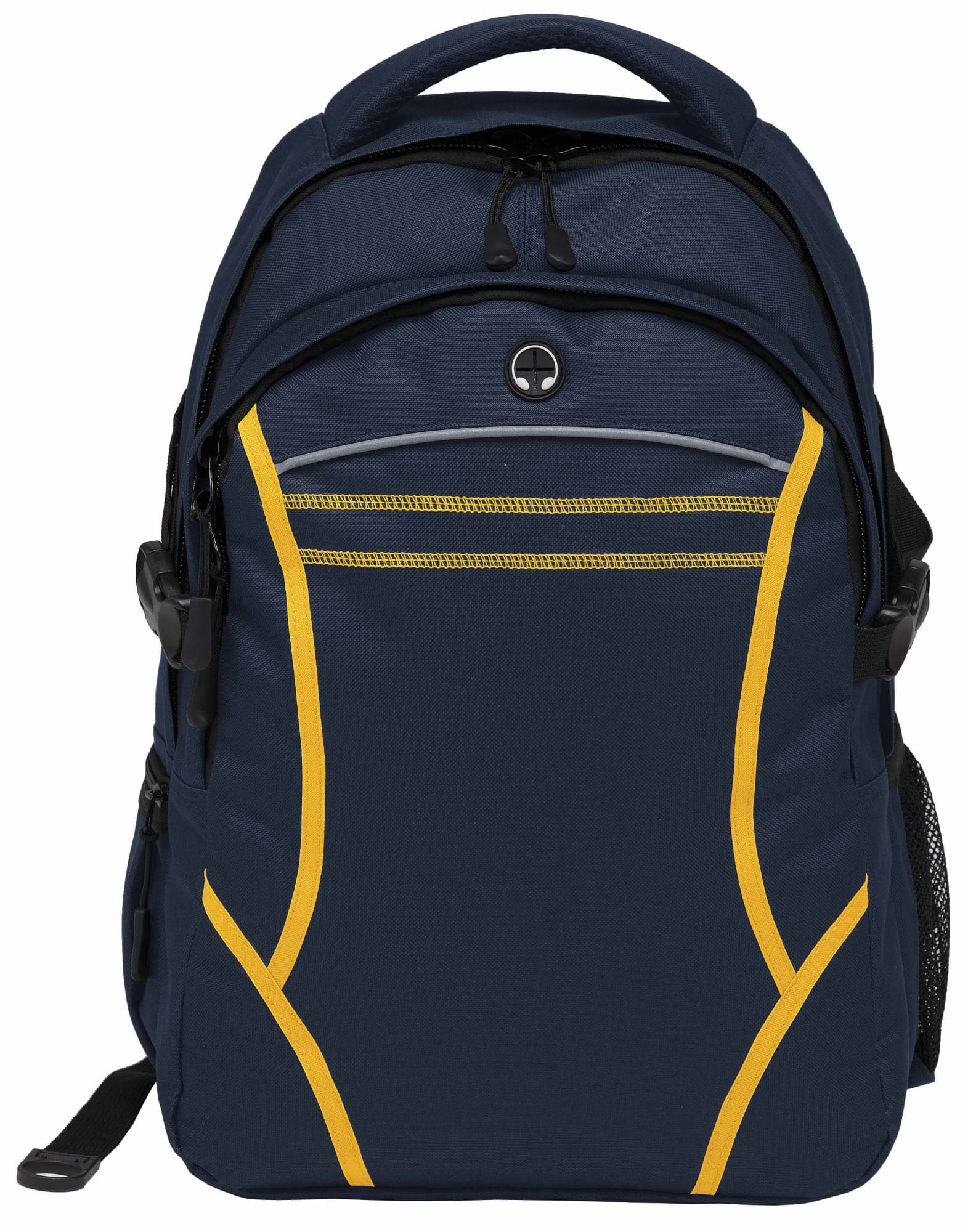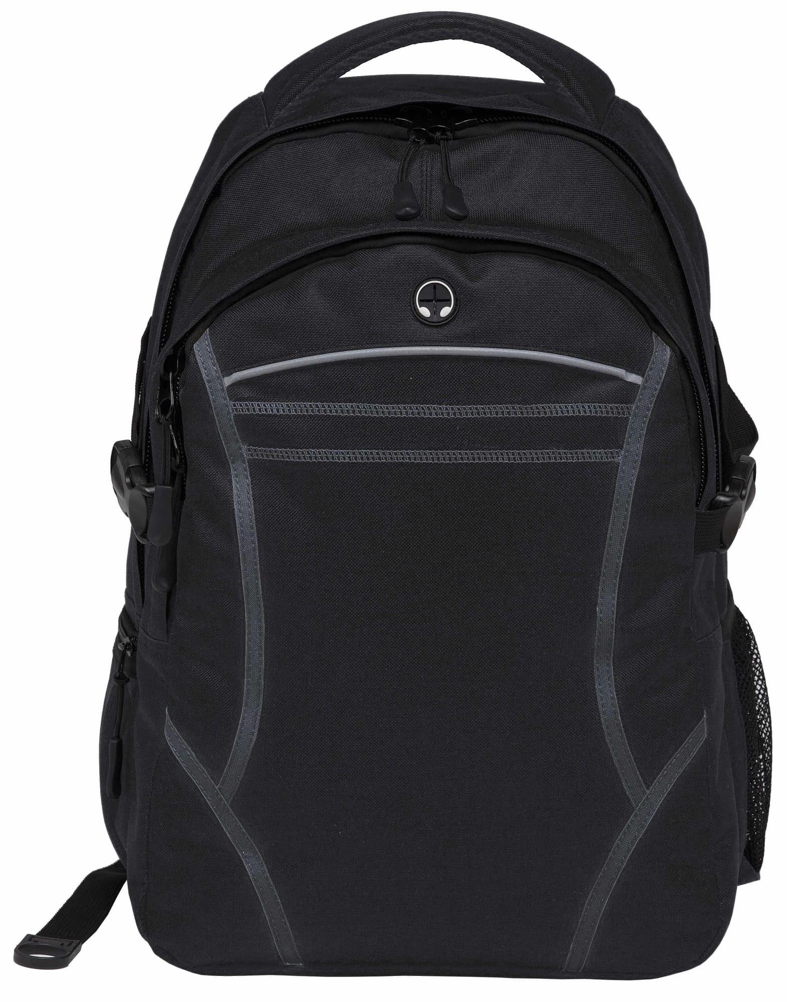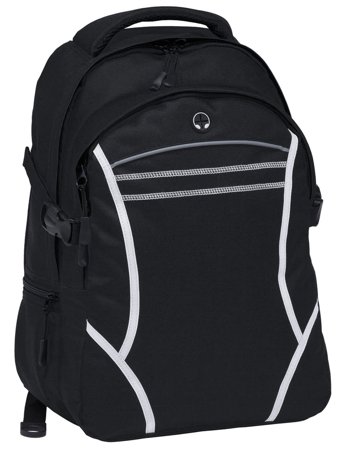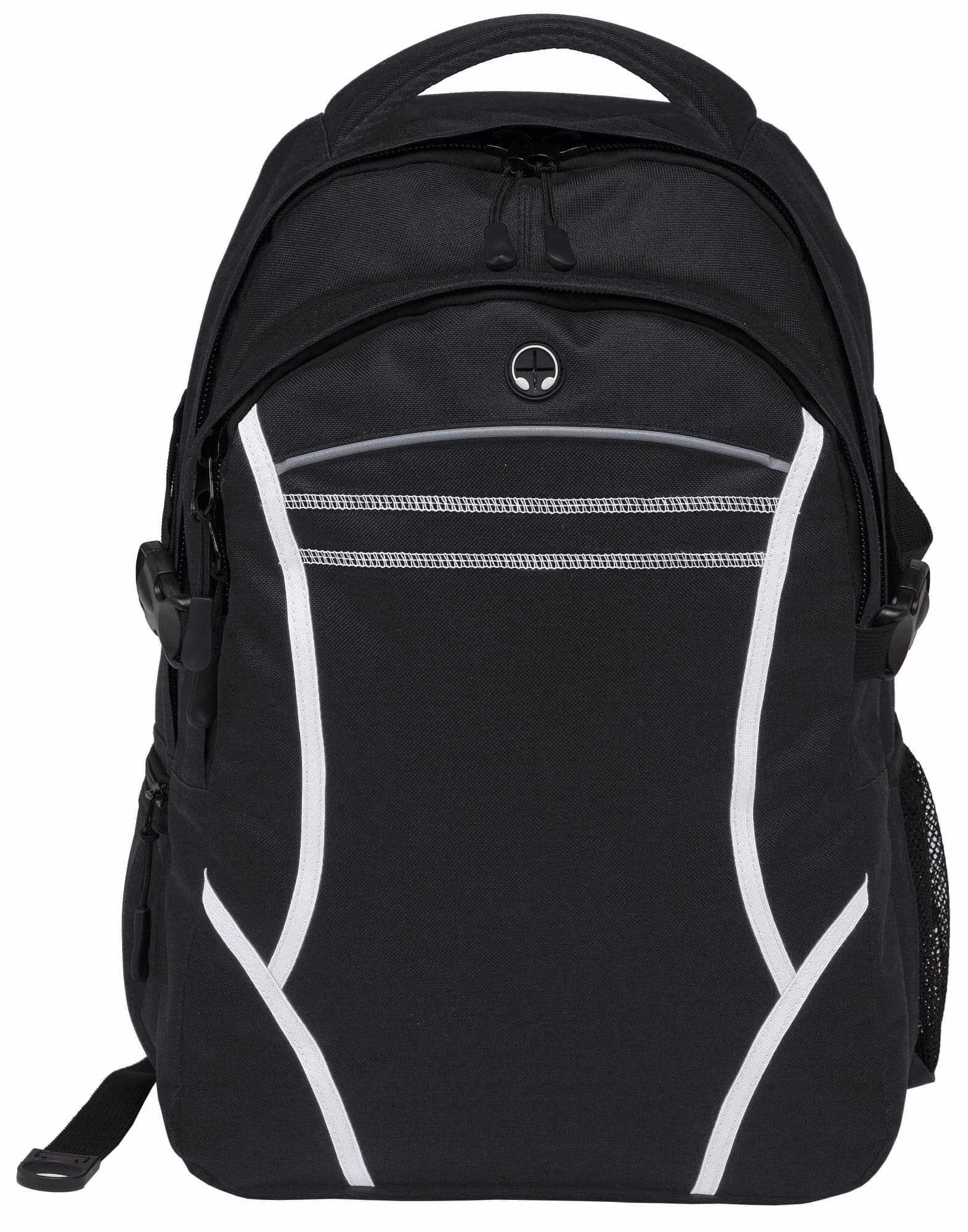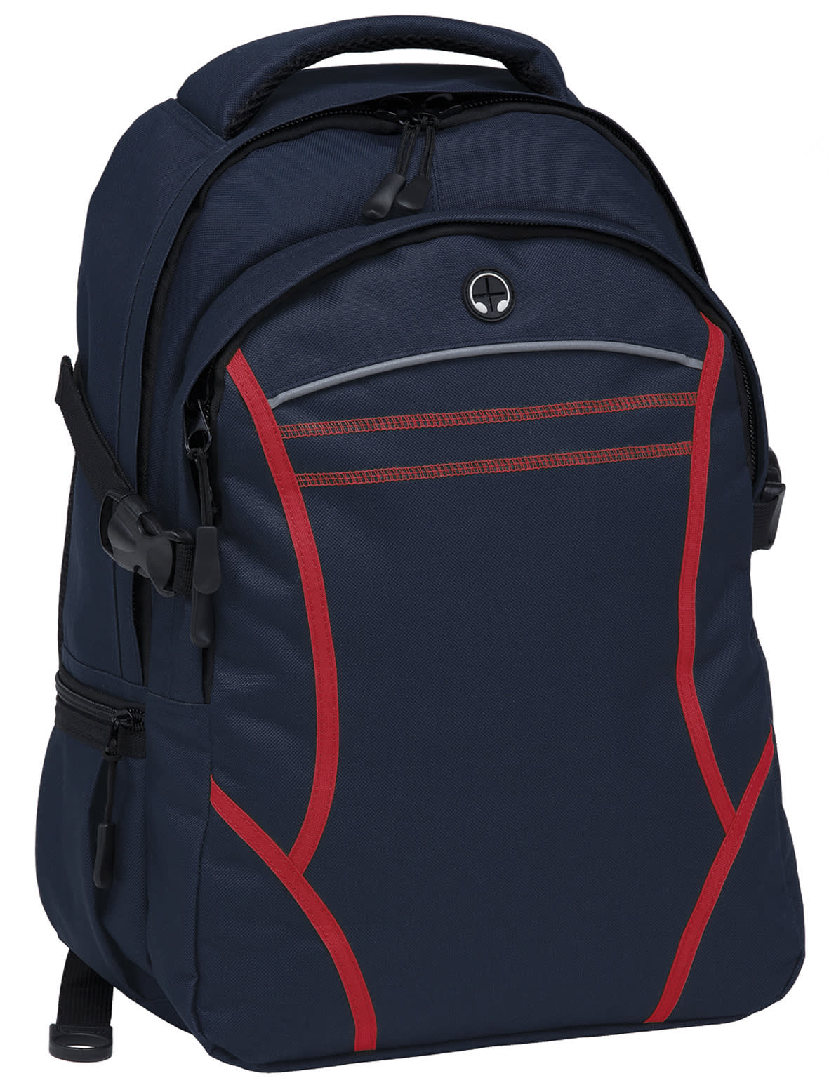 600D polyester with latex rubber backing|Two separate storage compartments|Padded iPad compartment with adjustable Velcro closure|Contrast fabric detailing on front|Contrast twin cover stitch detailing and reflective piping on front|Mesh backed shoulder straps and contoured padded mesh back panels|Quick release side compression straps|Mesh drink bottle pocket|Zippered side accessory pocket|Heavy duty zippers and accessories|Rubber feet for added protection|Mesh backed padded quick grab handle|Rubber headphone exit port on front compartment|Capacity: 28 Litres