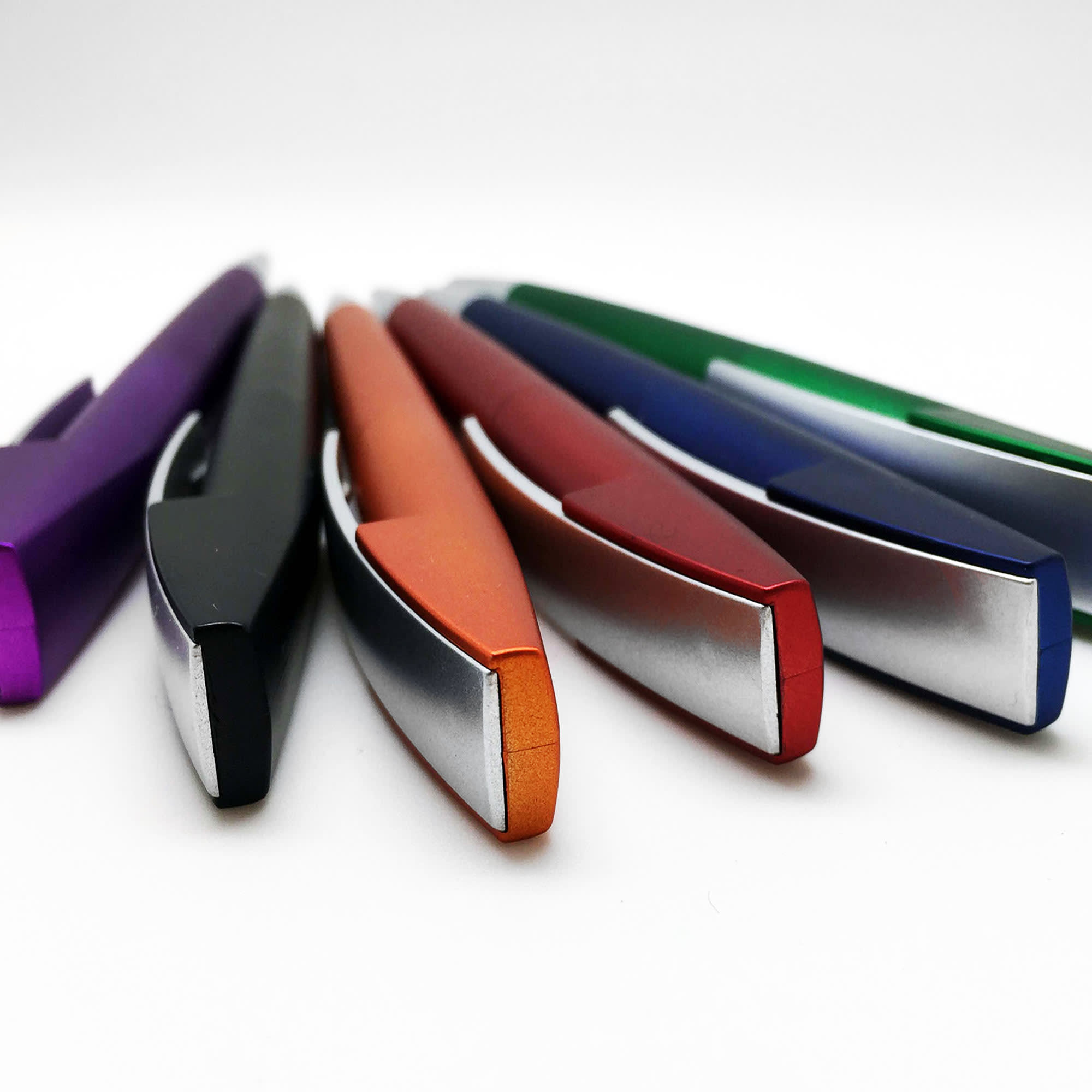 This high-tech looking European style plastic pen with metallic coloured barrel and matt silver chrome clip and tip large printing area on clip twist action with high quality German manufactured black ink refill 1800 meters writing distance tungsten carbide ball provides you with quality writing.