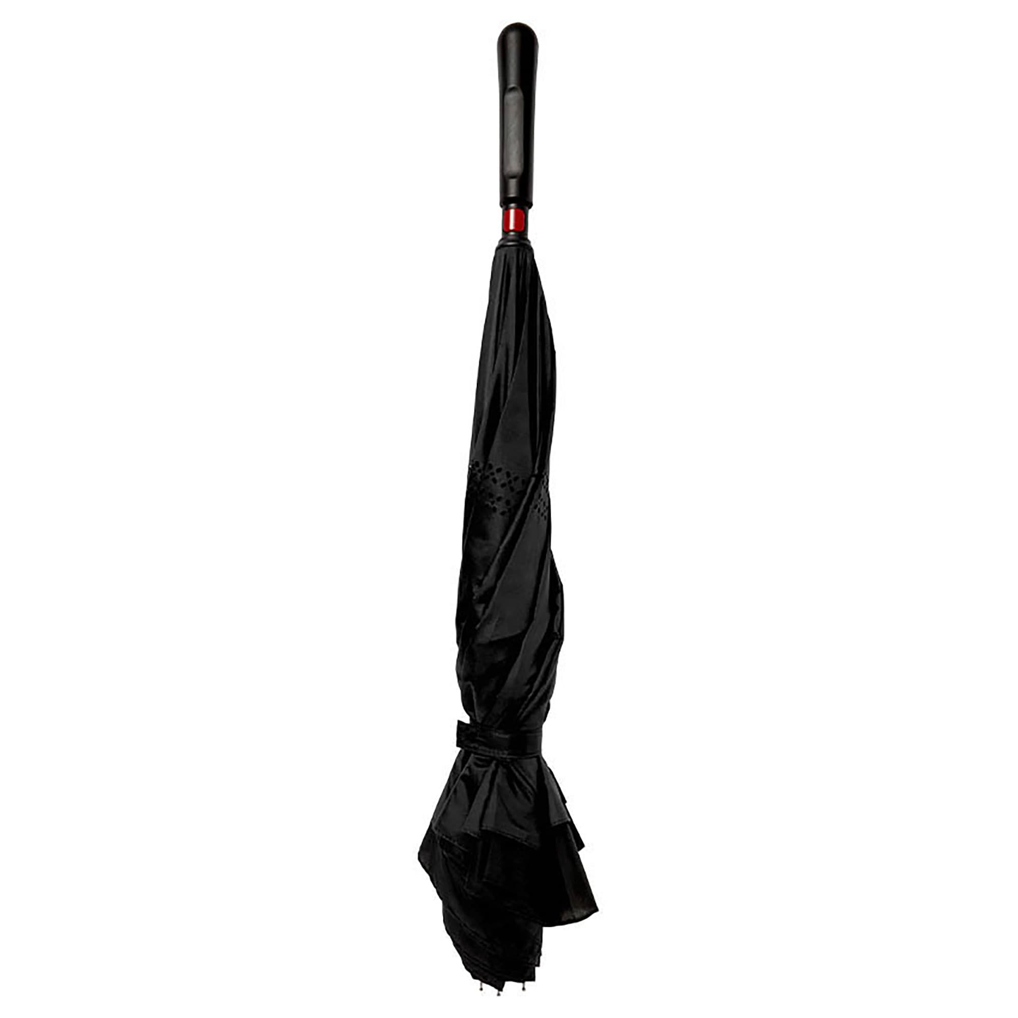 High quality inverted umbrella turns the traditional umbrella upside down and inside out easier to use and much more practical. Super simple to get in and out without getting wet it makes a waterproof cone when closed all the wetness stays inside not on your floor. 8 panel double layer 190T pongee wind proof canopy with auto opening and manual closing fiber glass ribs and metal shaft with black moulded soft-touch rubber handle which has a nylon wrist strap.