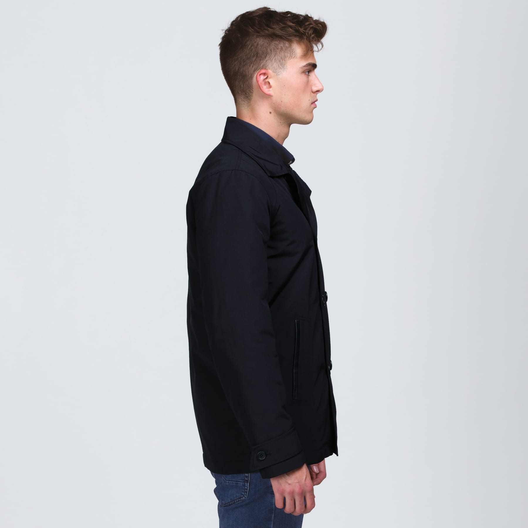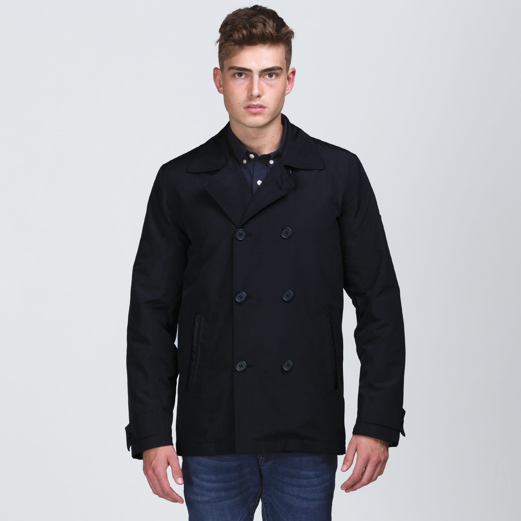 83% Polyester 17% Cotton with DWR water resistant coating|Tapered fit|Wind resistant|breathable|showerproof|Double breasted jacket with eight buttons|Notched label with faux leather underside trim|Fully lined with diamond quilting on body|Angled welt side picket with faux leather trim detail|Buttoned adjustable cuff tabs|Zippered branding access|Internal chest pocket|Internal hanger loop|smpli™ badge on sleeve shoulder position
