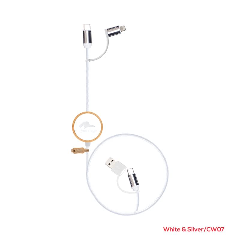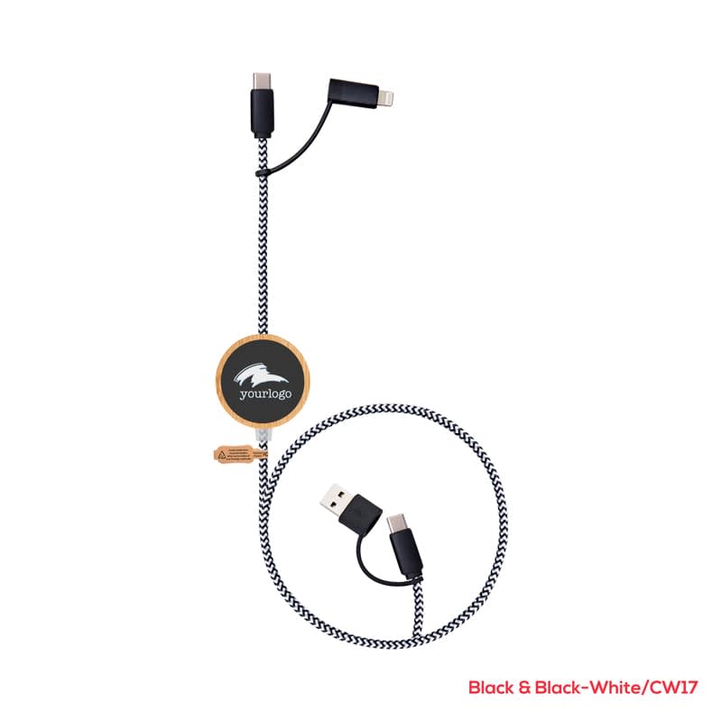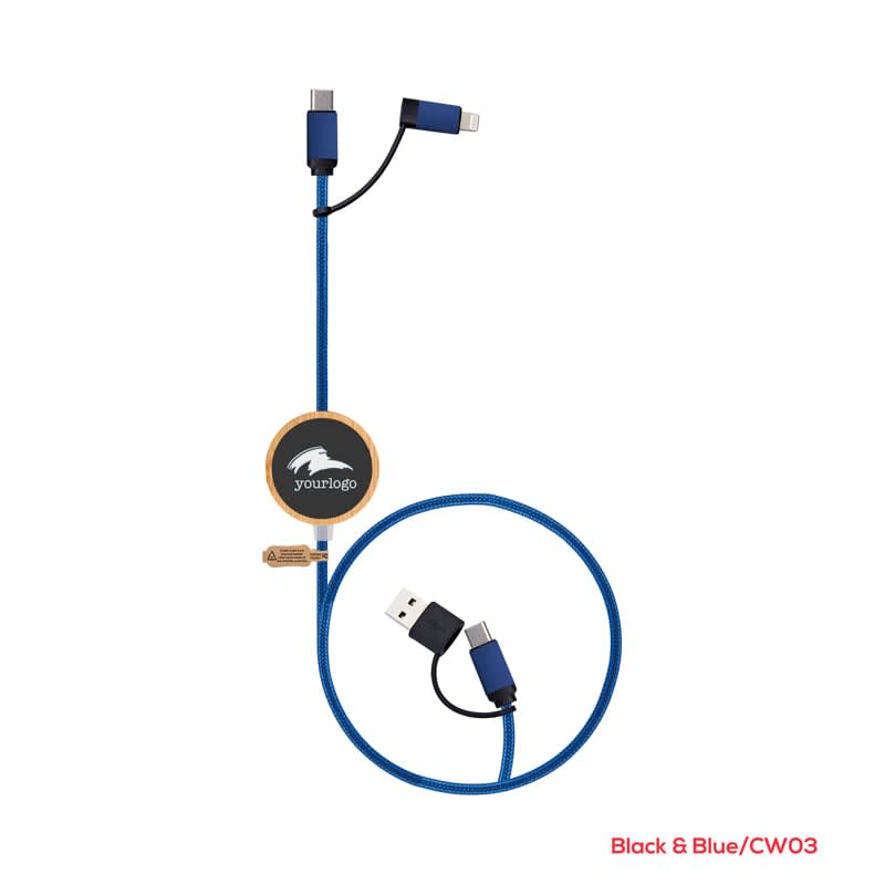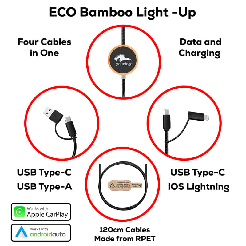 The Solento charging cable comes with a bamboo case and distinctive LED branding that brings your logo to life. This cable can deliver an output power of 60W (max) and supports high-speed charging and data transfer speeds of up to 480 Mbps. It is a versatile cable that can charge iPhones, Android smartphones, tablets, laptops, and all other USB-powered devices. The Solento is eco-friendly, with 55% recycled materials and high-quality copper wire. It includes the essential charging connectors such as Type-C and Lightning. This cable is compatible with all devices and supports QC2.0, QC3.0, 60W Power Delivery, Samsung Fast Charging, Android Auto, and Apple Car Play. Additionally, the Solento comes in a customised recycled kraft box to enhance your brand. The materials used in its construction include Bamboo, RPET, RTPE, RABS, RPE, and Copper.
