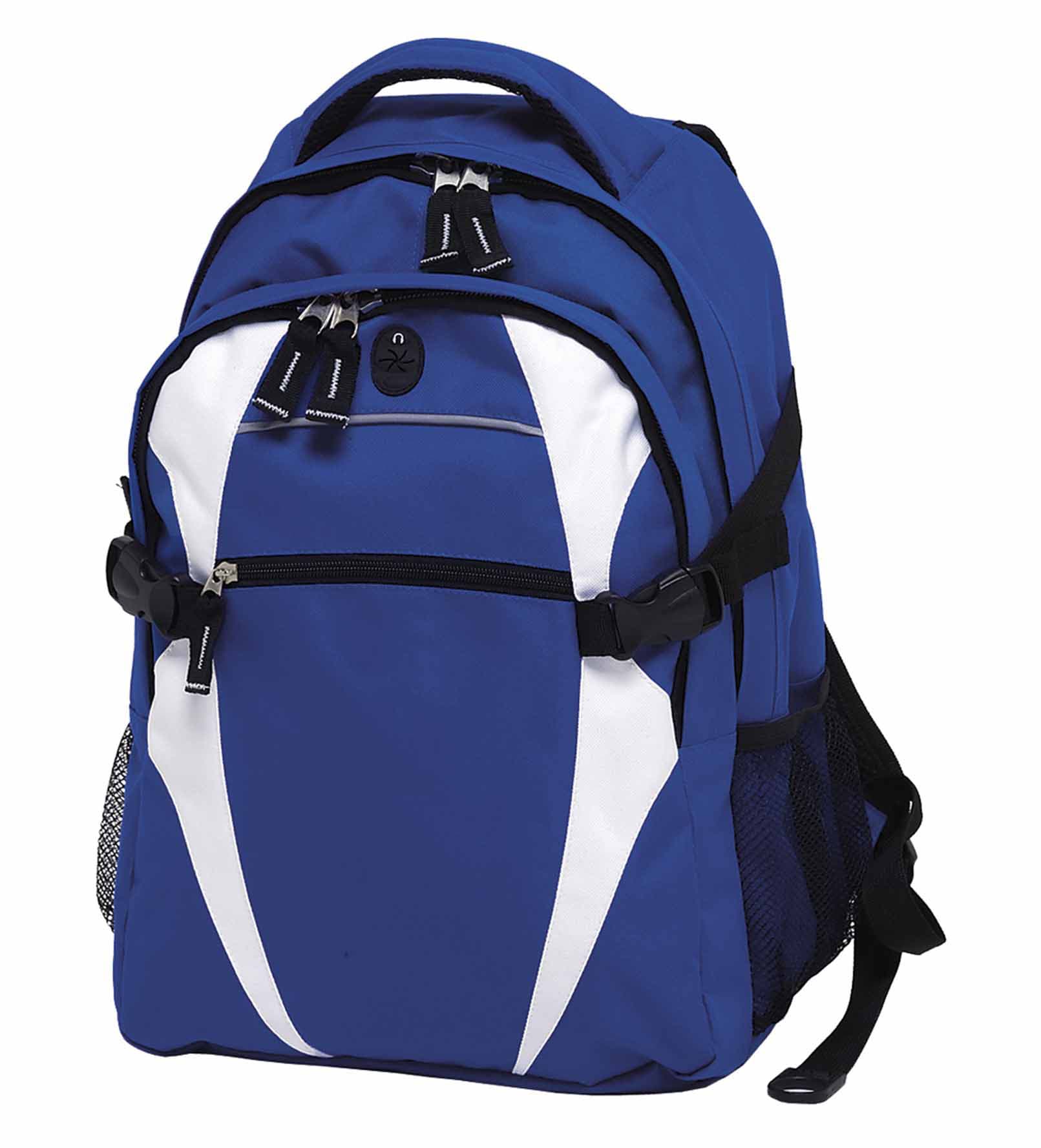600D polyester with latex rubber backing|Two separate storage compartments|Quick stash zippered front pocket with reflective piping|Mesh backed shoulder straps and contoured padded mesh back panels|Quick release side compression straps|Dual mesh drink bottle pockets (bottles shown not included)|Heavy duty zippers and accessories|Rubber feet for added protection|Mesh backed padded quick grab handle|MP3 pocket in front compartment with rubber headphone exit port|Capacity: 28 Litres