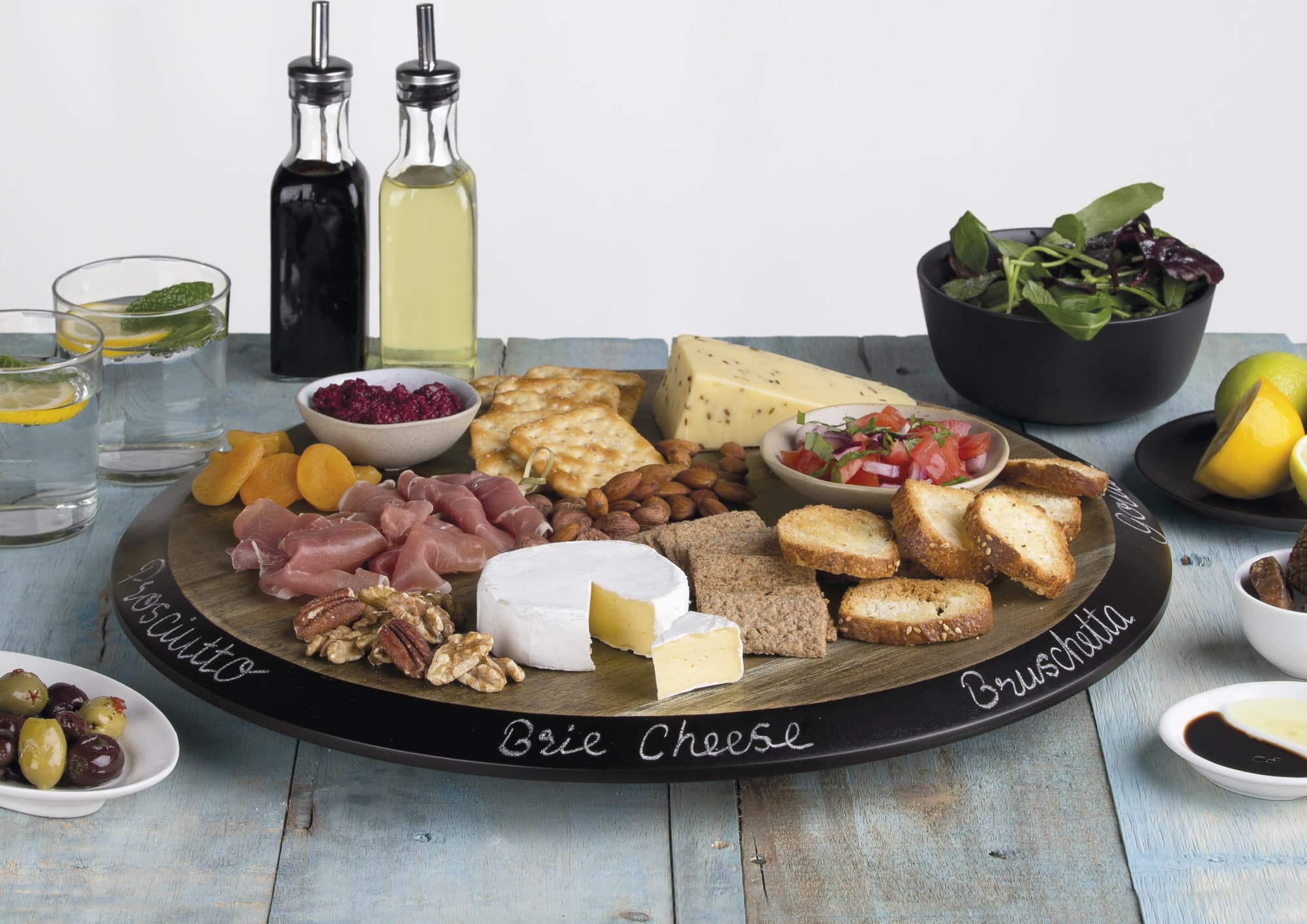 Plantation grown Acacia hardwood with FDA grade food oil finish|18’ large circular rotating serving area with 1” wide chalkboard rim|2pcs of chalk for easy labeling|Each board displays its own character through its unique wood grain and subtle patina finish|Supplied: in a black po ‘di fame two part presentation box (47cm W x 47cm H x 5.3cm D)