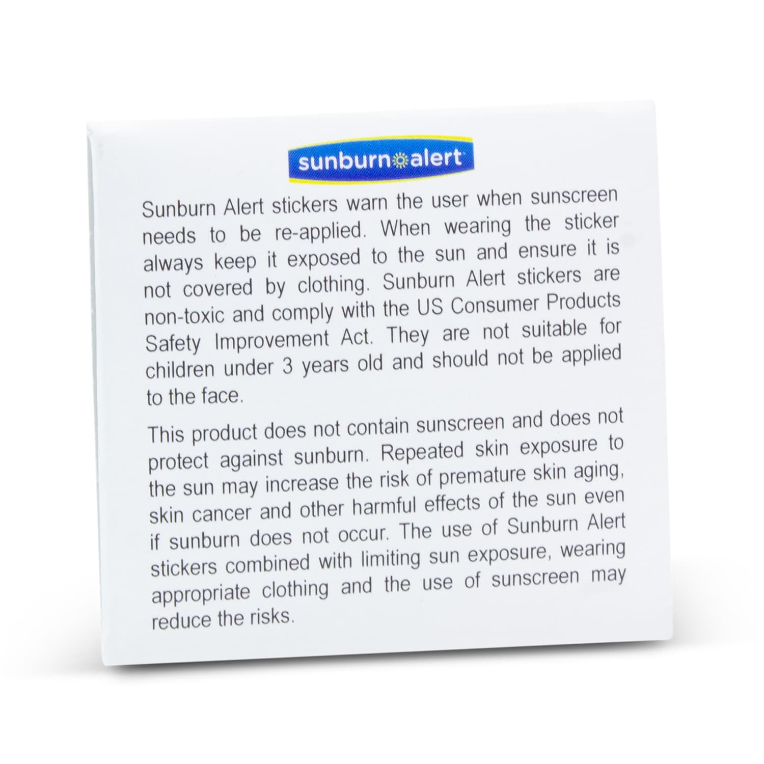 Pack of four Sunburn Alert Stickers that take the guesswork away from when it is time to re-apply sunscreen. They are a practical and easy to use warning device for anyone who is out in the sun. The user places a sticker on the back of their hand and applies sunscreen over it at the same time it is being applied to other parts of the body. Each sticker is UV sensitive and turns blue when sunscreen protection diminishes and the skin is being exposed to harmful UV rays. The sticker will turn white again when sunscreen is re-applied, indicating protection has been restored. Instructions for application and use are printed on the cardboard pack and it can be branded in full colour on the front at no extra cost. This product is not suitable for children under three years old, does not contain sunscreen and does not protect the user against sunburn. A production lead time of 25 working days applies to this product by air freight.
