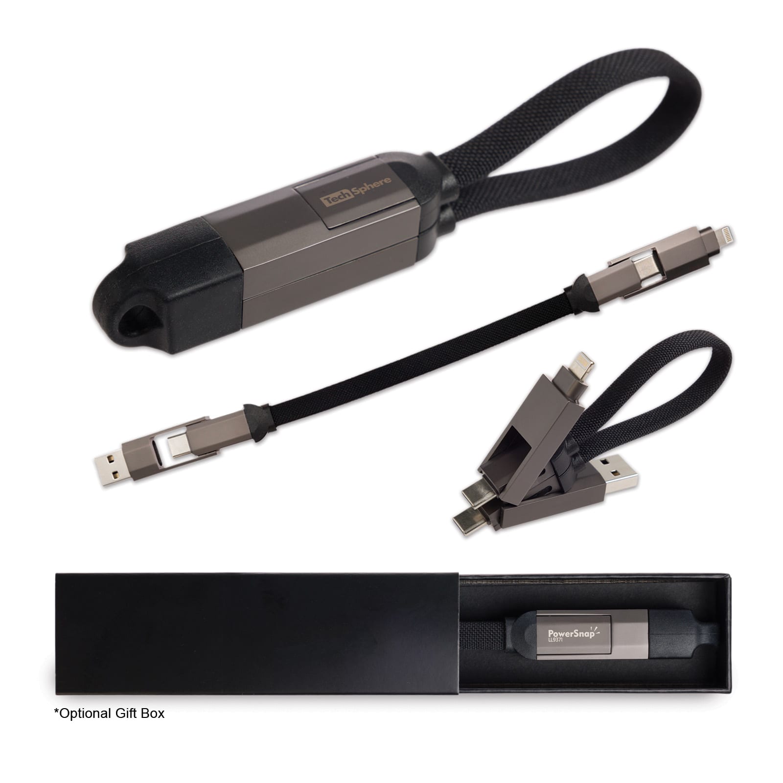 Introducing the Swing 4-in-1 Combo Cable — a compact and clever charging solution designed for everyday carry. At just 20cm long, this cable clips onto your keyring so you’ll never be without a charger when you need one. The metal ends and black ribbon cord give it a sleek, durable finish, while the magnetic closure and rubber cap keep the connectors protected when not in use. It’s also available packaged in a black gift box, making it a practical and stylish gift option. With four connector combinations — USB-A to USB-C, USB-A to Lightning, USB-C to USB-C, and USB-C to Lightning — it covers a wide range of devices. Charging speeds vary by connection type: USB-C to USB-C delivers the fastest charge at up to 60W (20V/3A), USB-A to USB-C supports up to 27W (9V/3A), and both Lightning combinations support 10W (5V/2A) — sufficient for standard charging of Apple devices. Data transfer runs at USB 2.0 speeds of up to 480Mbps across all connections.