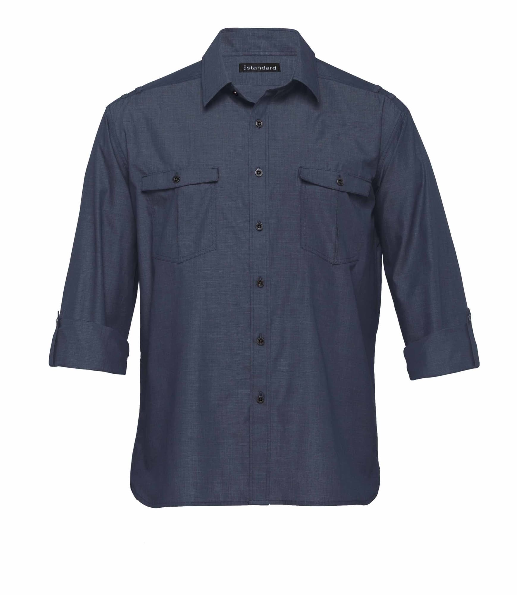 65% polyester 35% cotton two tone end on end|Tapered fit|Fashion collar|Metal look buttons|Twin loops on shoulders|Buttoned breast pockets|Long sleeve adjustable to sleeve with sleeve tab
