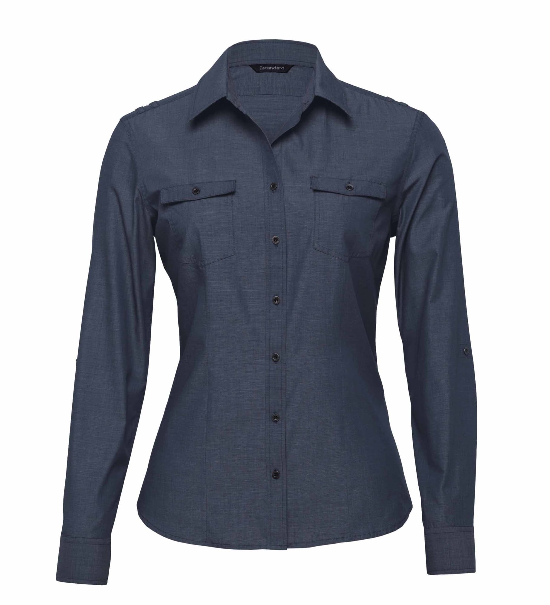 65% polyester 35% cotton two tone end on end|Tapered fit|Fashion collar|Metal look buttons|Twin loops on shoulders|Buttoned breast pockets|Shaped body detailing front and back|Long sleeve adjustable to ¾ sleeve with sleeve tab|Contoured hemline
