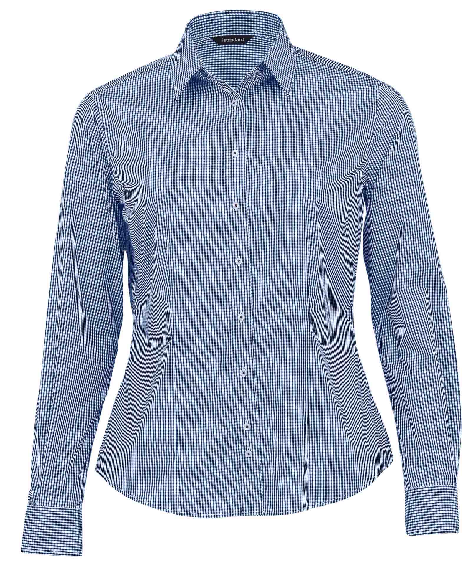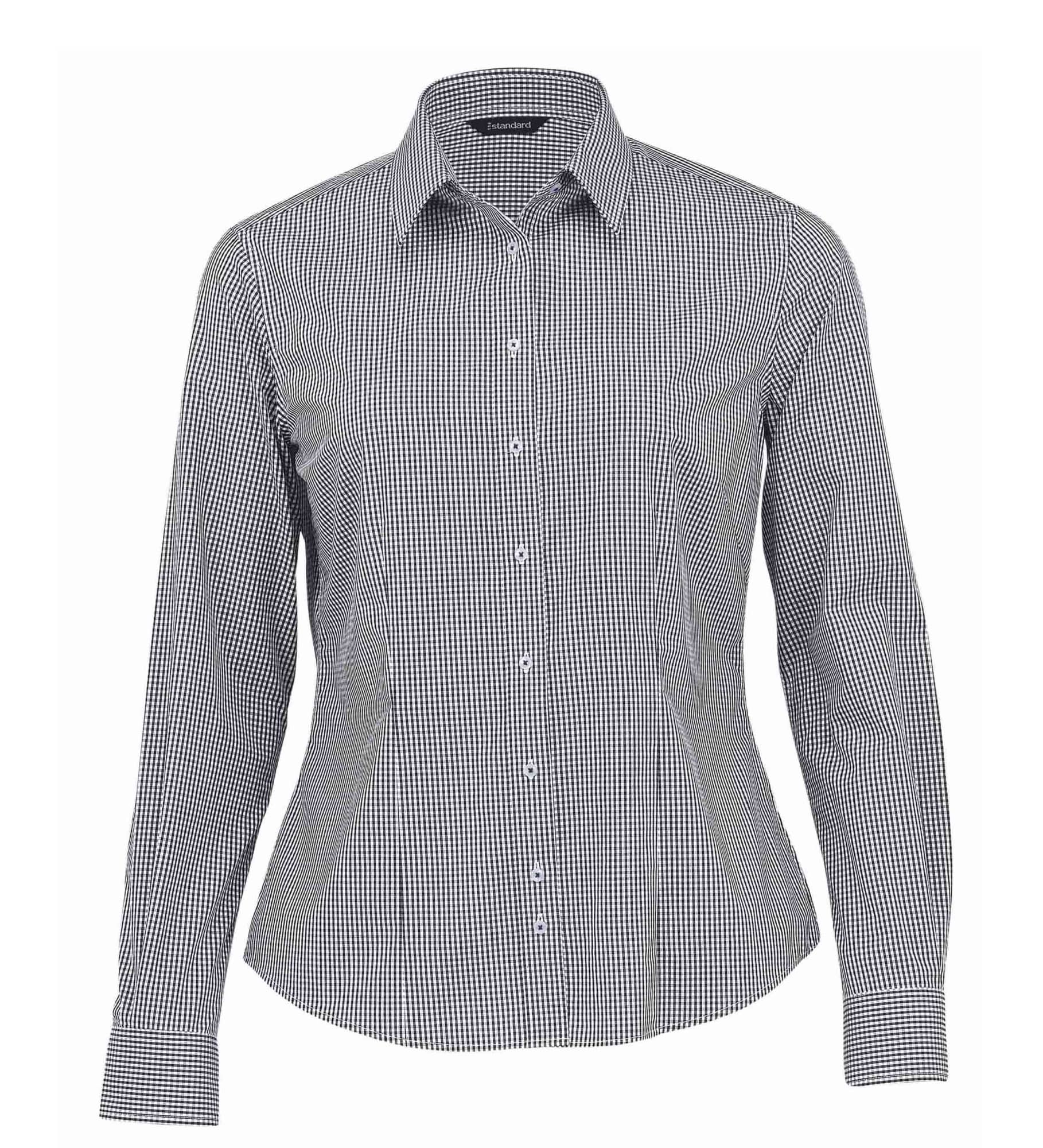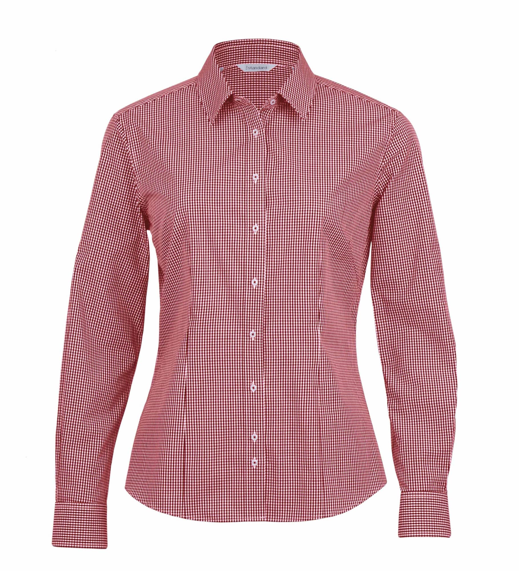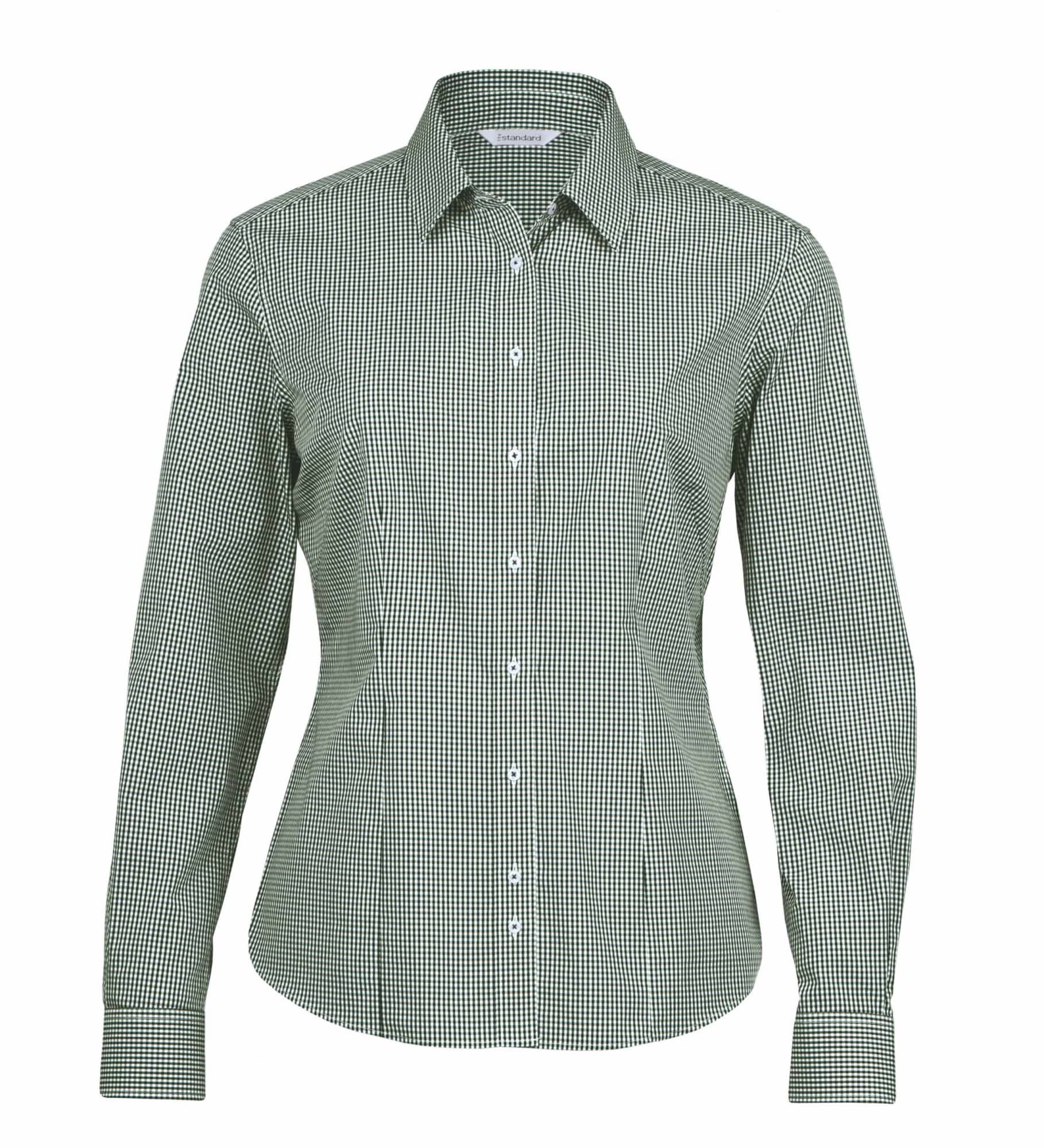 100% cotton yarn dyed gingham|Tapered fit|Fashion collar|Long sleeves|Shaped body detailing front and back|Contoured hemline|Contrast stitching on buttons