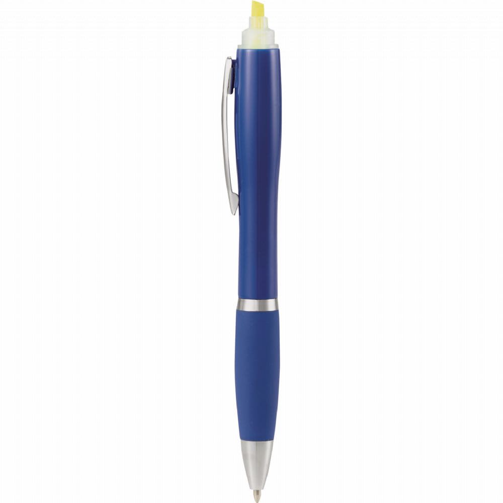 Dual-function. Twist-action ballpoint pen and yellow highlighter with removable cap.