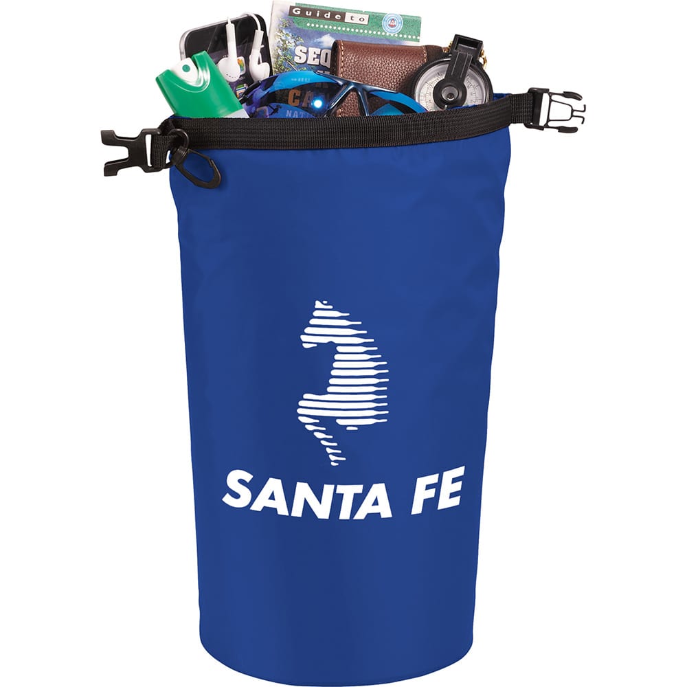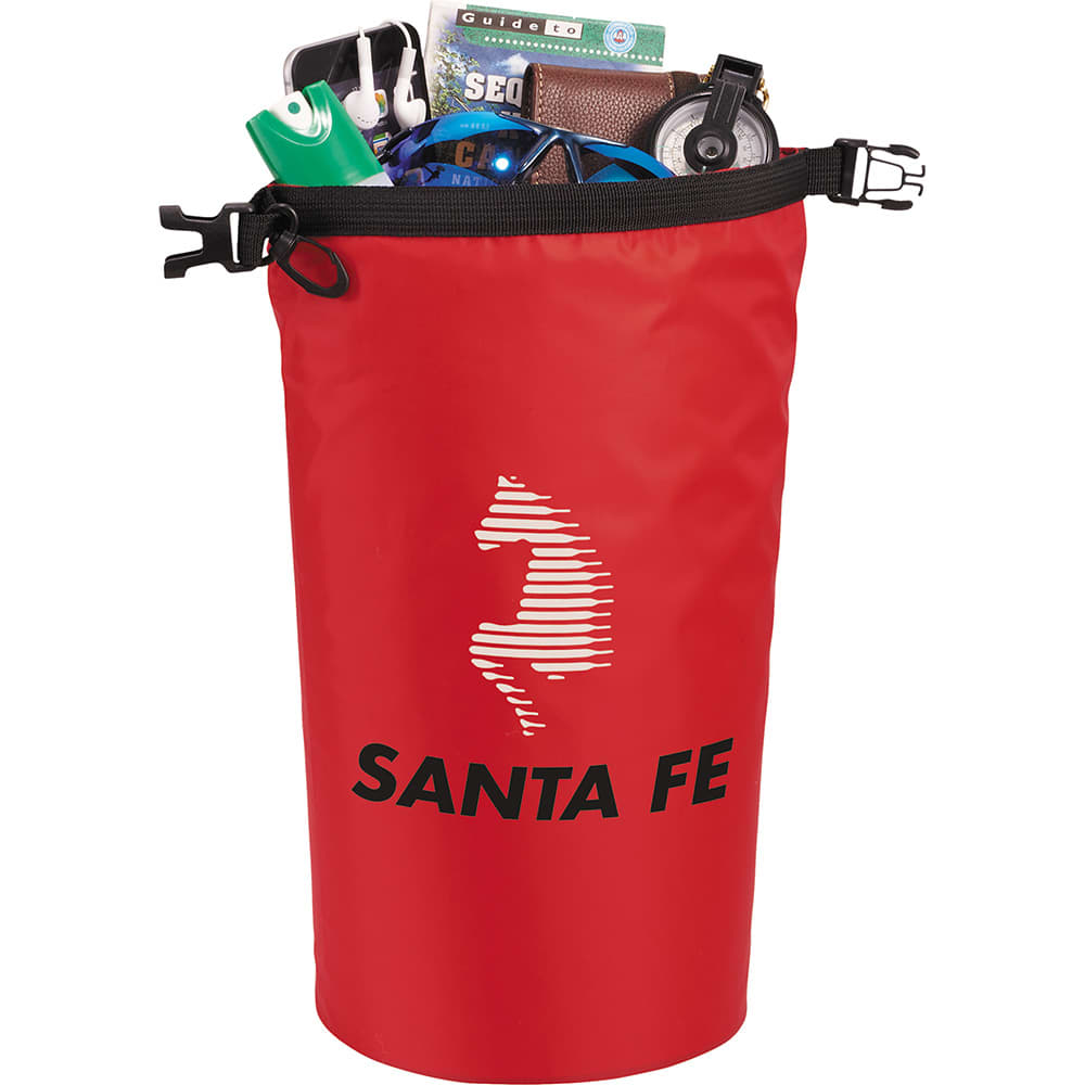 Waterproof outdoor bag. Roll-top closure with plastic buckle to keep your valuables dry and safe on outdoor activities. Easily snaps on a bag or belt.