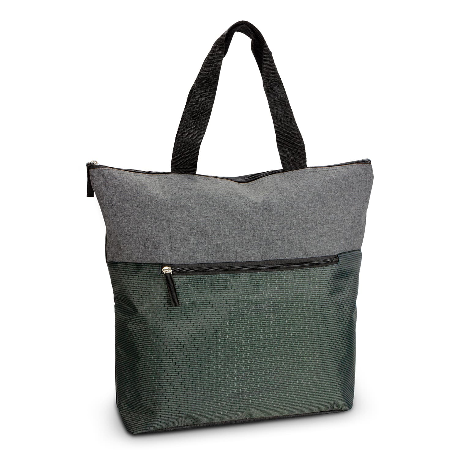 Sophisticated tote bag which is manufactured from a combination of on-trend heather style 300D polyester with a 600D polyester back panel. It has a distinctive front pocket with an eye-catching patterned finish and a zippered closure. Other features include strong woven carry handles, a secure zippered top closure, smart woven zipper pulls and a base gusset for added carrying capacity.
