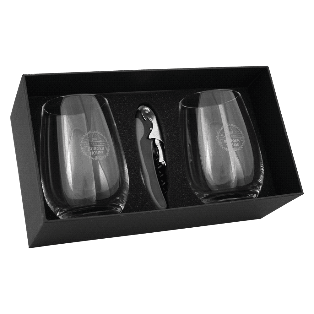 Two piece wine glass set with waiters friend. This set is beautifully boxed in a black two piece gift box with foam insert. 450ml capacity.