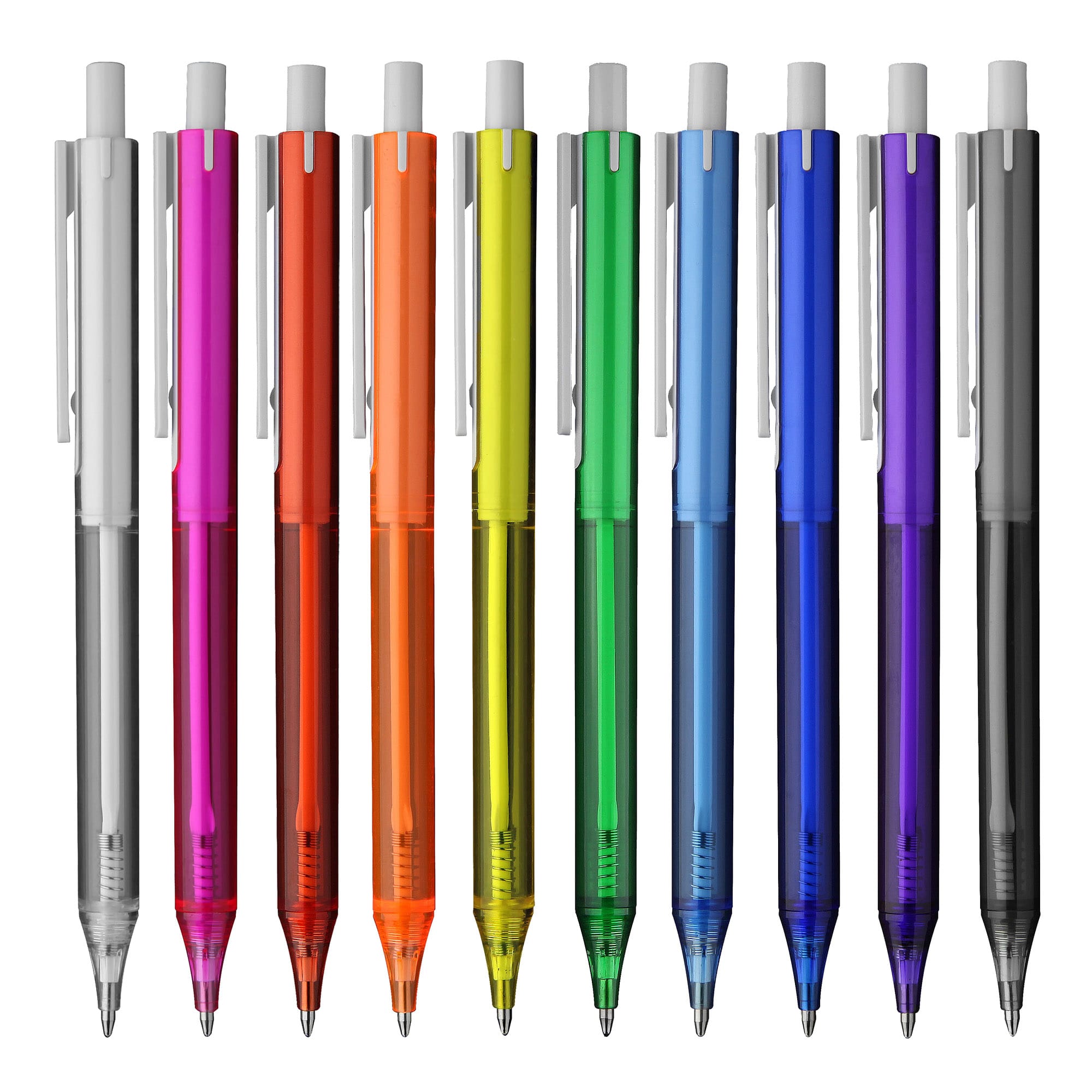 Simple slim design with click action plastic pen solid white push button and clip with coloured transparent barrel and tip it has high quality German manufactured black ink refill 1800 meters writing distance tungsten carbide ball provides you with quality writing a budget pen with simple modern design and comfortable writing ready for your next large event.