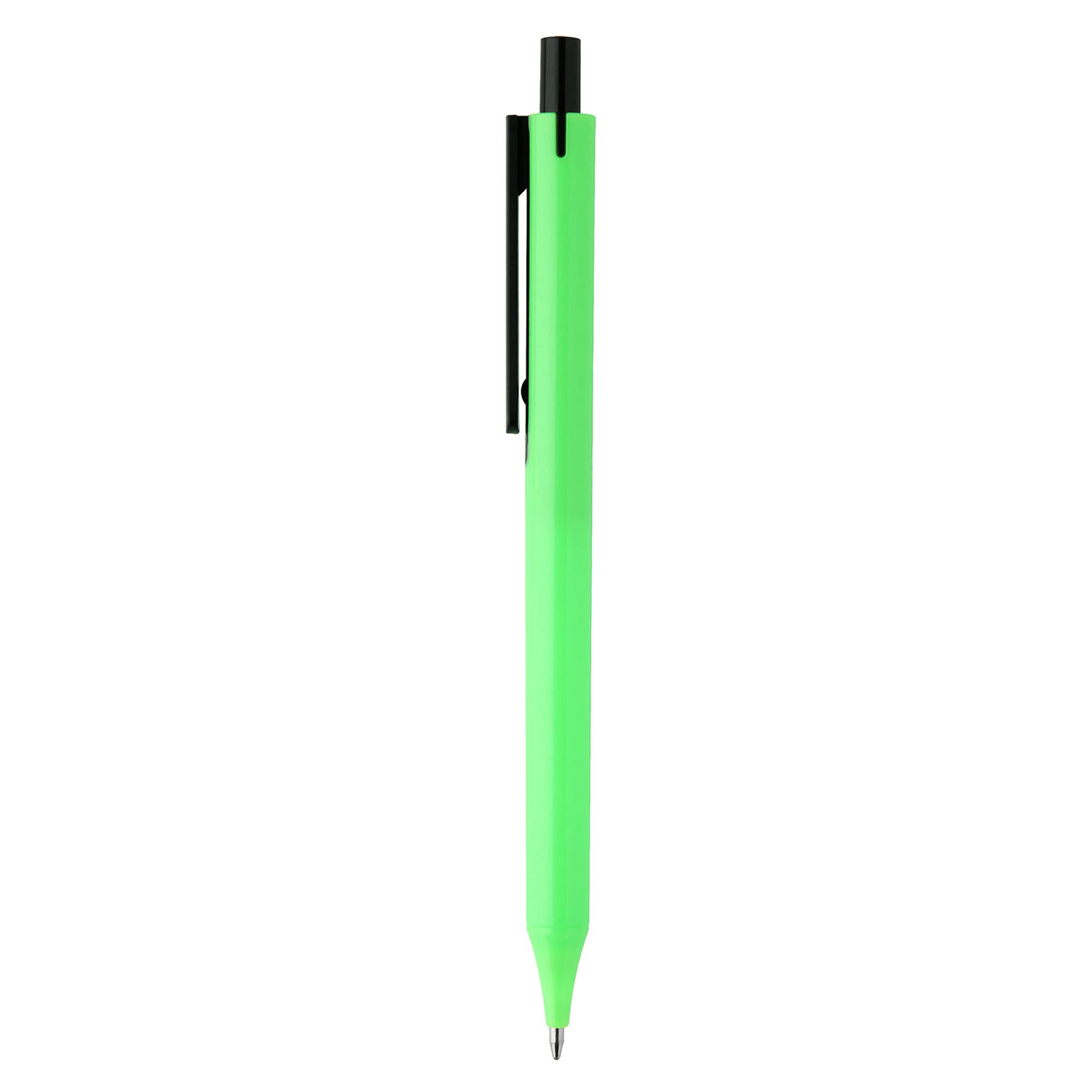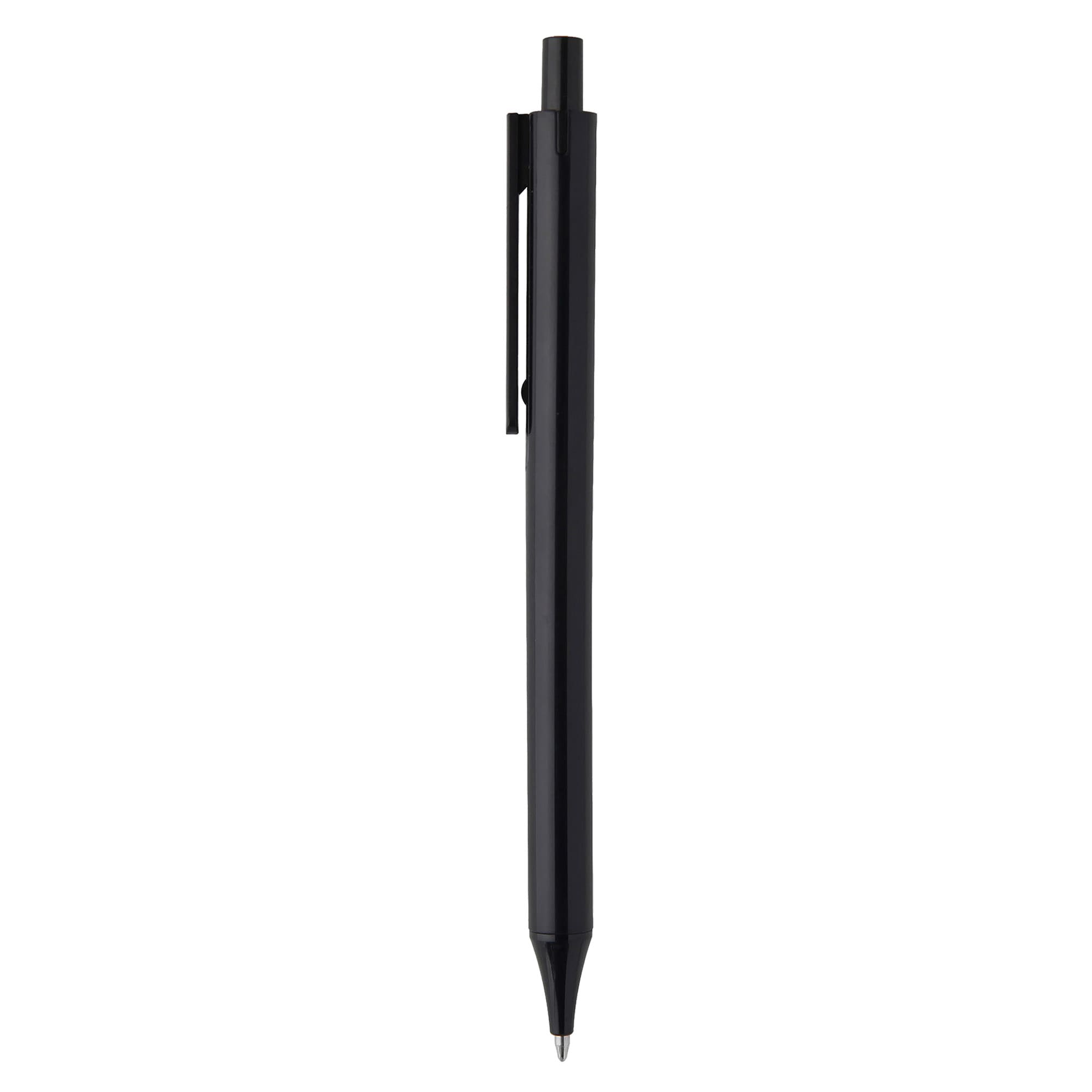 Simple slim design with click action plastic pen solid black push button and clip with coloured barrel and tip it has high quality German manufactured black ink refill 1800 meters writing distance tungsten carbide ball provides you with quality writing a budget pen with simple modern design and comfortable writing ready for your next large event.
